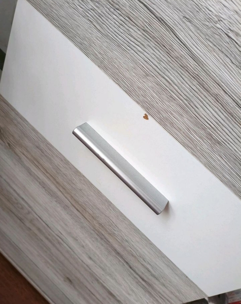 Außerdem hat der linke Schrank oben Löcher, weil ich es anfangs falsch zusammengeschraubt habe. Vorne an der Tür ist ebenfalls eine Macke vom Umzug.