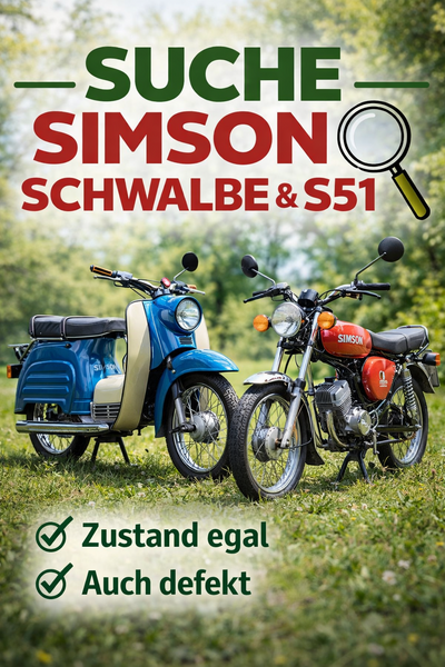Ich suche eine Simson Schwalbe oder eine S51. Gerne auch zum Wiederaufbau und nicht fahrbereit. Einfach alles anbieten :)