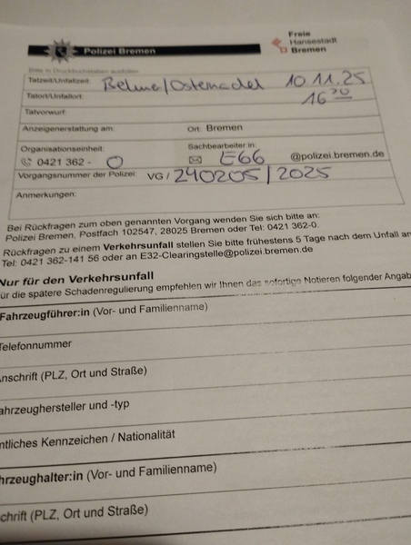Ort mit Umkreis Tenever, Arbergen, Mahndorf, Sebaldsbrück, Hastedt, Vahr. Motorroller rammte Auto.