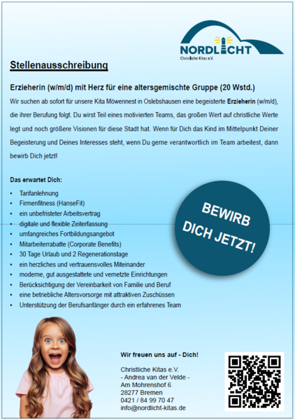 Wir suchen ab sofort für unsere Kita Möwennest in Oslebshausen eine begeisterte Erzieherin (w/m/d), die ihrer Berufung folgt. Du wirst Teil eines motivierten Teams, das großen Wert auf christliche Werte legt und noch größere Visionen für diese Stadt hat. Wenn für Dich das Kind im Mittelpunkt Deiner Begeisterung und Deines Interesses steht, wenn Du gerne verantwortlich im Team arbeitest, dann bewirb Dich jetzt!