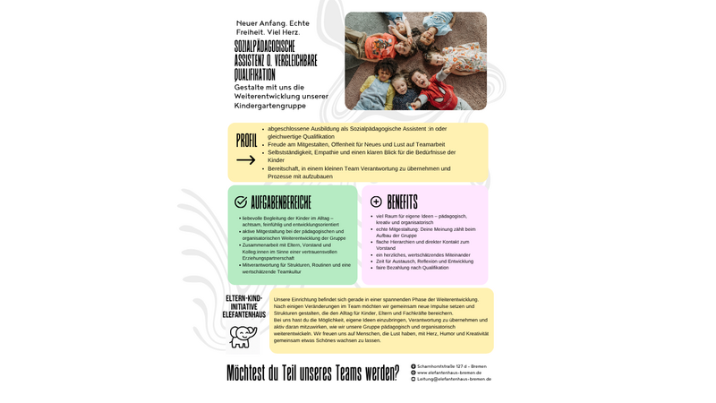 die Freude daran hat, gemeinsam mit uns eine lebendige, sichere und kreative Umgebung für Kinder zu gestalten.