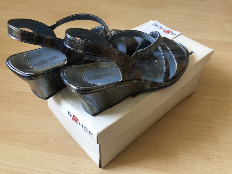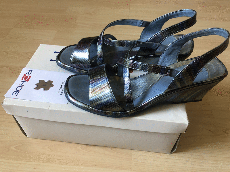 Firma Rohde, Gr. 38 / USA 7.0, echt Leder, trendig Pythonmetallic/Lack, aktuelle Mode, mit dem Schlupfschuh aus geprägtem Leder kommen sie gut über die warme Jahreszeit und bringt modische Augenblicke. Die spezielle Sohle sorgt für einen sicheren Halt. Die anspruchsvoll handwerkliche Verarbeitung zeigt sich insbesondere in der geschnittenen Silhouette. Der Artikel ist wenig genutzt und fast neuwertig, Privatverkauf, siehe Fotos, Neupreis 79€, jetzt nur 20,00€, Versand (€ 5,00) bei Kostenübernahme möglich