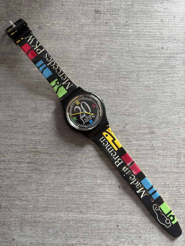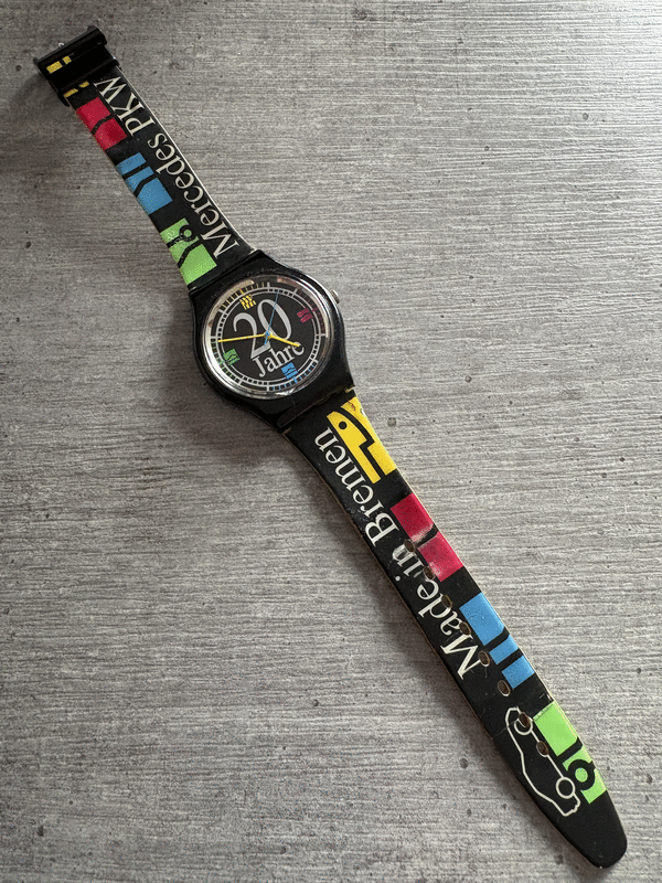 -Sammlerstück- Armbanduhren zum 20ten Geburtstag des Mercedes Benz Werkes Bremen. Wurde an Mitarbeiter ausgegeben. Nicht im Handel erhältlich. Diese Uhr macht aus jedem Outfit einen farbenfrohen Look. Die bunten Ziffern und Zeiger machen diese Uhr einmalig. Daten: Gewicht 20g, 3 Uhrzeiger, Gehäuses 38mm, Krone Edelstahl, Bandlänge 230mm, Dornschließe Edelstahl, Batterie muss ggf. getauscht werden, technisch einwandfreies und geprüftes Produkt. Diese tolle Uhr sucht jetzt eine liebevolle Neubesitzer/in. Artikel im sehr guten, getragenen Zustand, Tierfreier Nichtraucherhaushalt! Privatverkauf, siehe Fotos, jetzt nur 19€, Versand (€ 3,00) bei Kostenübernahme möglich