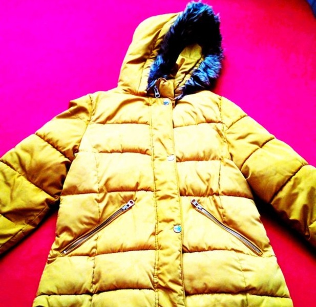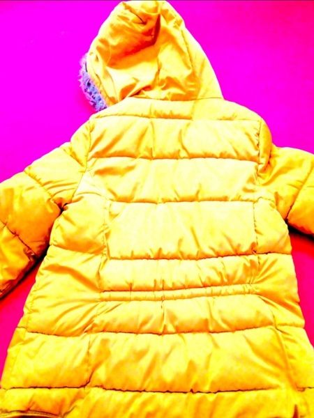 Schöne gelbe Daunenjacke mit zwei Taschen mit Reißverschlüssen.