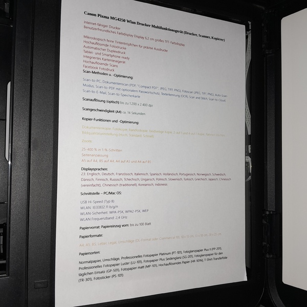 Canon Pixma MG4250 Wlan Drucker Multifunktionsgerät (Drucker, Scanner, Kopierer) mit vollen Patronen. Das Gerät druckt sehr scharf in Bildqualität und ist voll funktionstüchtig. Gerät kann getestet werden. Preis 35 € Festpreis.
