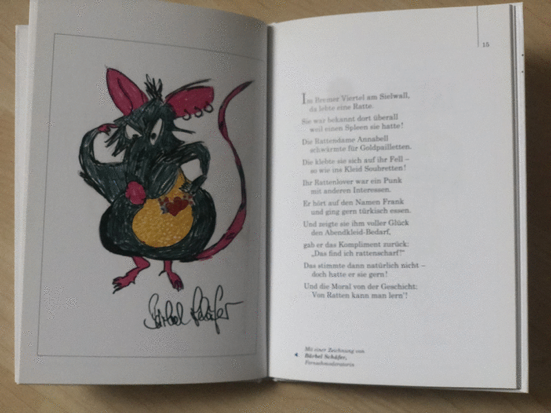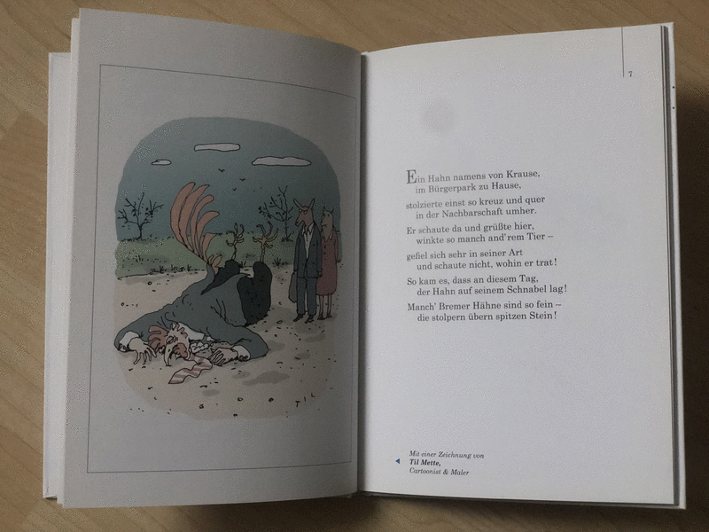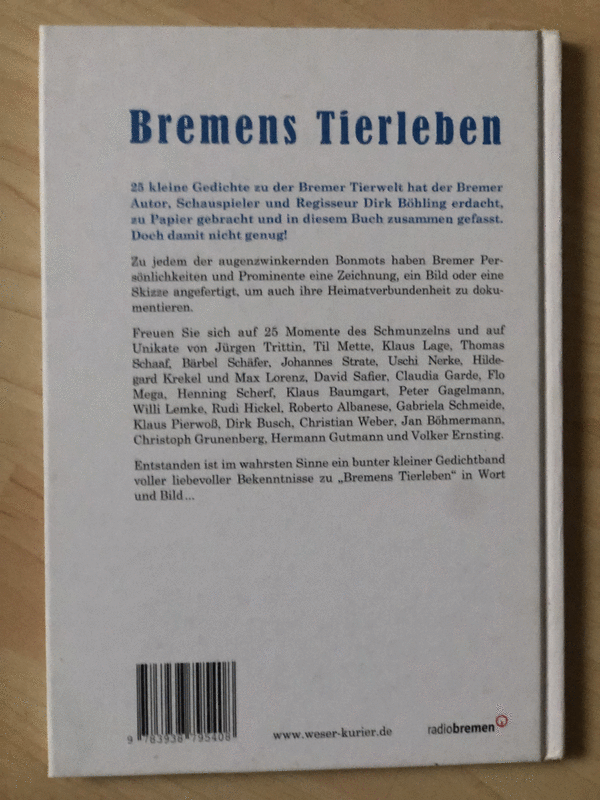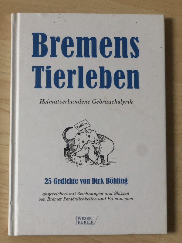 Heimatverbundene Gebrauchslyrik - Buch Erstausgabe, Dirk Böhning, 25 Gedichte angereichert mit Zeichnungen und Skizzen von Bremer Persönlichkeiten und Prominenten. Gebunde Hardcover Ausgabe, 64 Seiten, ca. 150 x 210 mm, Verlag: Bremer Tageszeitungen.