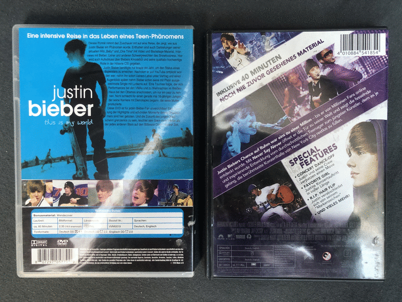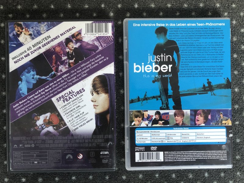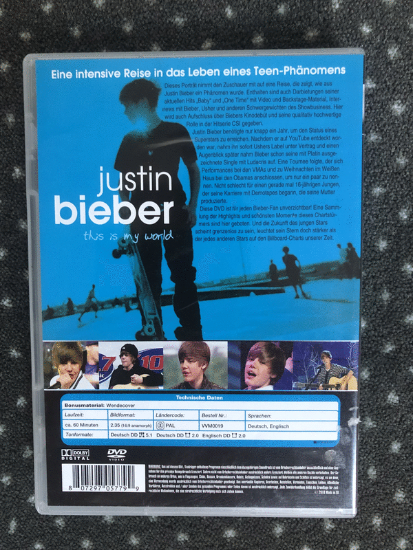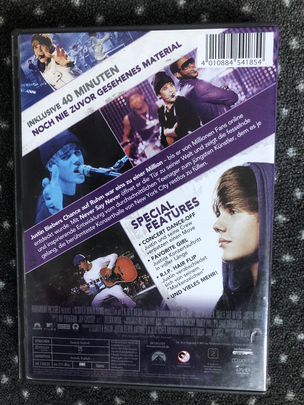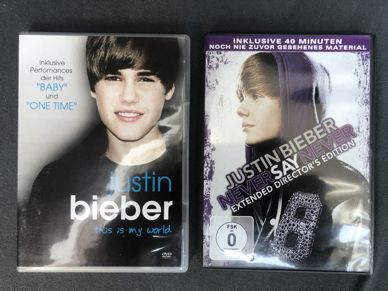 Diese einzigartigen DVD‘s nimmt den Zuschauer mit auf eine Reise, die zeigt, wie aus Justin Bieber ein Phänomen wurde. Justin ist gerade mal 17 und weiß es aber schon ganz genau. Never Say Never, gerade er ist das lebendige Beispiel für die These „Sag niemals nie“. Denn Justin Bieber ist ein Phänomen. Dank Web 2.0 schafft er mit 14 einen kometenhaften Aufstieg. Für seine Konzerttournee 2010 reist Justin Bieber um die ganze Welt. Erlebe die getriebene Seite des Popstars, die bisher nur wenige gesehen haben auf DVD, Dokumentation/Musikfilm, einzigartige Performances der Hits. Diese Rarität sucht jetzt einen liebevollen Neubesitzer und ist ein tolles Geschenk für einen Sammler oder eine Trophäe für sich selbst. Gut erhaltene Artikel, siehe Fotos, Tierfreier Nichtraucherhaushalt! Privatverkauf, Einzelpreis 6,00€ oder beide DVD‘s zusammen nur 10€, Versand 3€ bei Kostenübernahme möglich