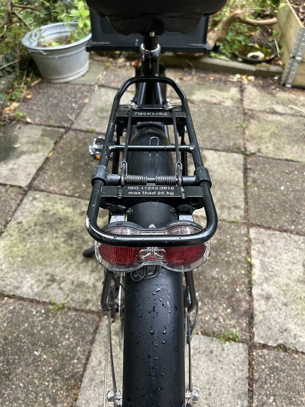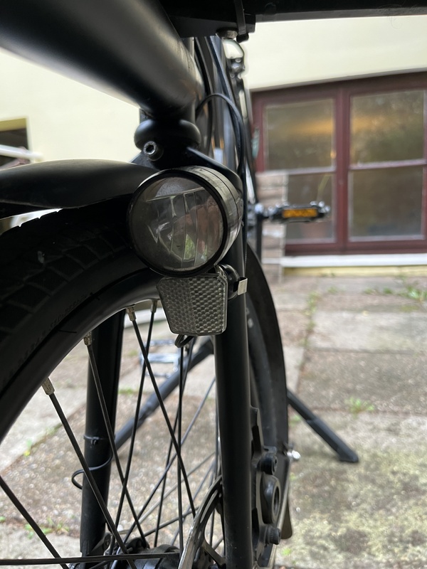 Außerdem: Laufrad Nabendynamo, Scheinwerfer hinten und vorne, Gepäckträger. Es hat an ein paar Stellen kleinere Kratzer- ich hatte ein Schloss, das hat am Schutzblech etwas geschrabbt, aber ansonsten ist das Rad tipptopp und für den Straßenverkehr bereit.