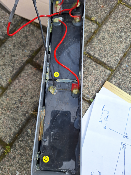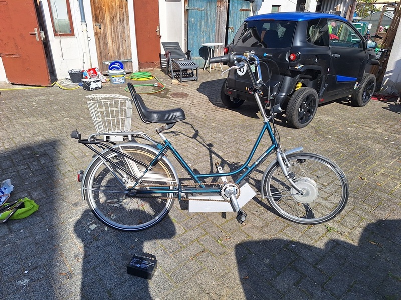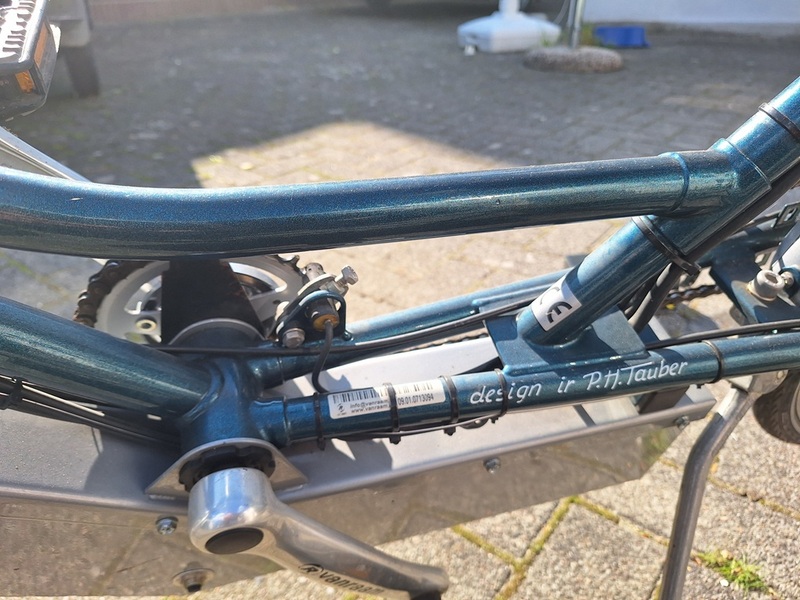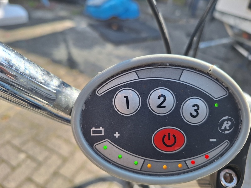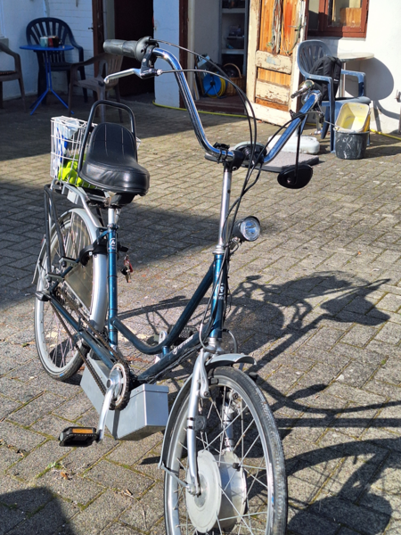 Das Rad hat einen sehr kräftigen Vorderrad E-Motor verbaut, der von 3x 12Volt Batterien, original von van Raam so gebaut, siehe Foto, gespeist wird. Die Reichweite liegt auf Stufe 1 bei 50kkm und auf Stufe 3 noch bei 30km. Die Batterien habe ich im Juni 2024 gewechselt. Die letzten hielten fast 10 Jahre. Batteriewechsel ist einfach und wahrscheinlich die kostengünstigste Art eines Akkuwechsels. Dadurch ist das Rad etwas schwerer wie mit LI Akkus. Das Rad wurde in letzter Zeit nicht so oft bewegt. Kettenschutz fehlt. Reifen sind von mir erneuert worden.
