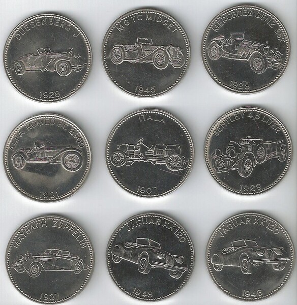Seltenes Fundstück! 10x Shell Münzen Weltberühmte Sportwagen, Ø Münze: 3 cm, sehr guter Zustand.