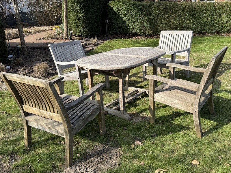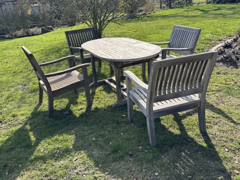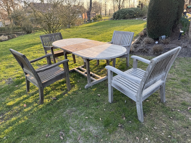 Gartensitzgruppe, bestehend aus einem ausklappbaren Tisch (Höhe 70 cm, Breite 90 cm, Länge 148 cm (200 cm ausgeklappt) und 4 rustikalen Stühlen), Material: Teak-Holz