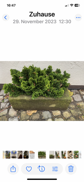 Frisch geschnittene Zweige der edlen Muschelzypresse als Weihnachtsdeko abzugeben. Siehe Beispielfoto Sandsteintrog. Freiwilliger Spendenobolus zugunsten der Stiftung Rhododendronpark erbeten.