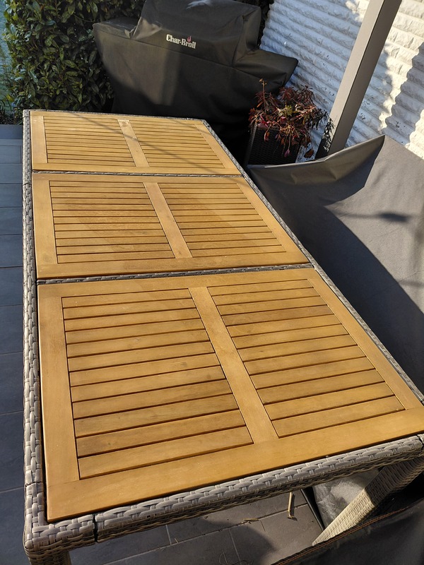 Biete einen Terrassentisch mit den Maßen 190 x 91 x 75 cm.