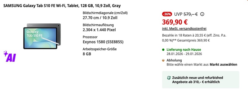 Display : 10,9 Zoll / 27,70 cm Bildschirmauflösung: 2.304 x 1.440 Pixel Octa-Cora / 8GB RAM / 128GB Speicher / Android / inkl. S-Pen