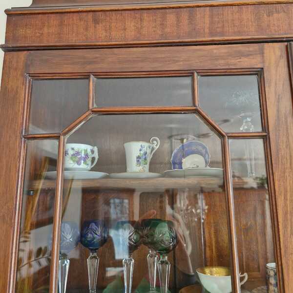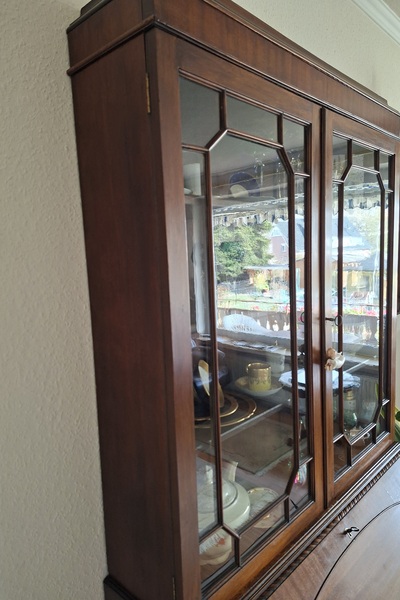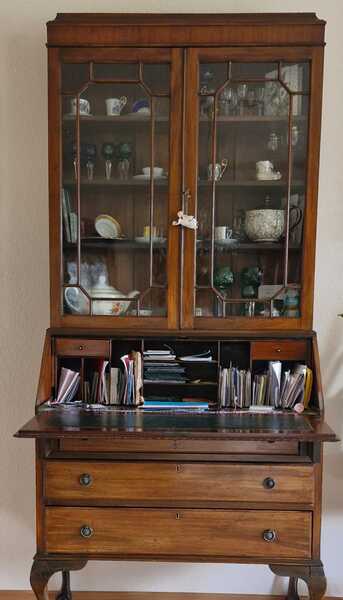 Biete einen antiken Sekretär an, ein elegantes Möbelstück. Es ist ein echter Blickfang und bietet vielseitigen Stauraum sowie eine praktische Schreibfläche. Mit warmer Holzmaserung. Oberteil mit zwei Glastüren als Vitrine und mit Einlegeböden. Ausklappbare Schreibplatte im Mittelteil. Unterteil mit 3 geräumigen Schubladen und Beschlägen. Ideal als stilvoller Arbeitsplatz oder zur Präsentation von Sammlerstücken. Der Sekretär ist aus hochwertigem Holz gefertigt und besticht durch seine zeitlose Eleganz. Er befindet sich in einem altersgemäß sehr guten Zustand und den üblichen charmanten Gebrauchsspuren, die seine Geschichte erzählen. Preis: 150 Euro