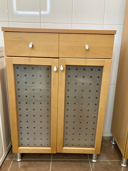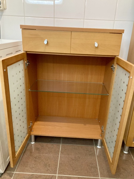 Badezimmerschrank Buche Breite 65 cm Tiefe 33 cm und Höhe 96 cm mit einer Schublade und einem Glasboden zu verkaufen VB 20€ Tierfreier und Nichtraucherhaushalt