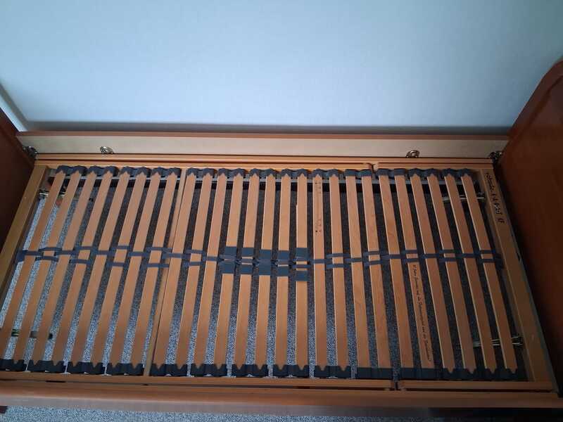Das Bett ist in sehr guten Zustand, einige Kratzer. Der Lattenrost kann im Rahmen auf verschiedenen Höhen eingelegt werden, ebenfalls sind Kopf- und Fussteil des Lattenrosts ebenfalls höhenverstellbar.