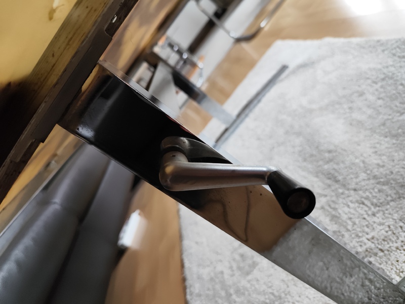 Couchtisch, mit schwerer Tischplatte. Gestell Edelstahl Optik. Die Platte kann herausgenommen werden. Ob die Kurbel funktioniert weiß ich nicht.