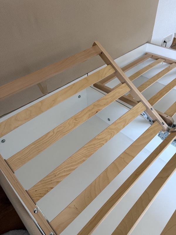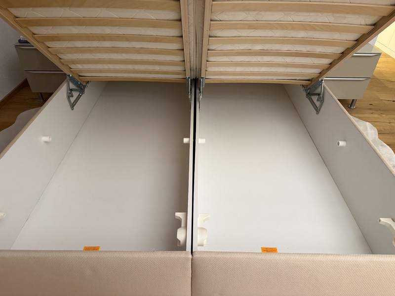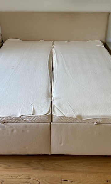 Ich verkaufe ein Polsterbett aus Holz und Stoff in Beige inkl. 2 x Lattenrost, 2 Matratzen plus Schoner und Tagesdecke. Das Bett besteht aus 2 verschraubbaren Teilen mit jeweils einem Bettkasten und einem Kopfteil. Das Lattenrost kann sowohl vorn als auch hinten aufgestellt werden. Im rechten Kasten ist ein kleiner Bruch (siehe Bilder). Es können nur leichte Bettwaren in die Kästen gelegt werden. Liegefläche: 160 x 200 (2x80) Kopfteil 180 breit Korpus: 170 breit. Damaliger NP vor 8 Jahren 1500€. Jetzt 50€ Tierfreier Nichtraucherhaushalt Abzuholen in Bremen Borgfeld