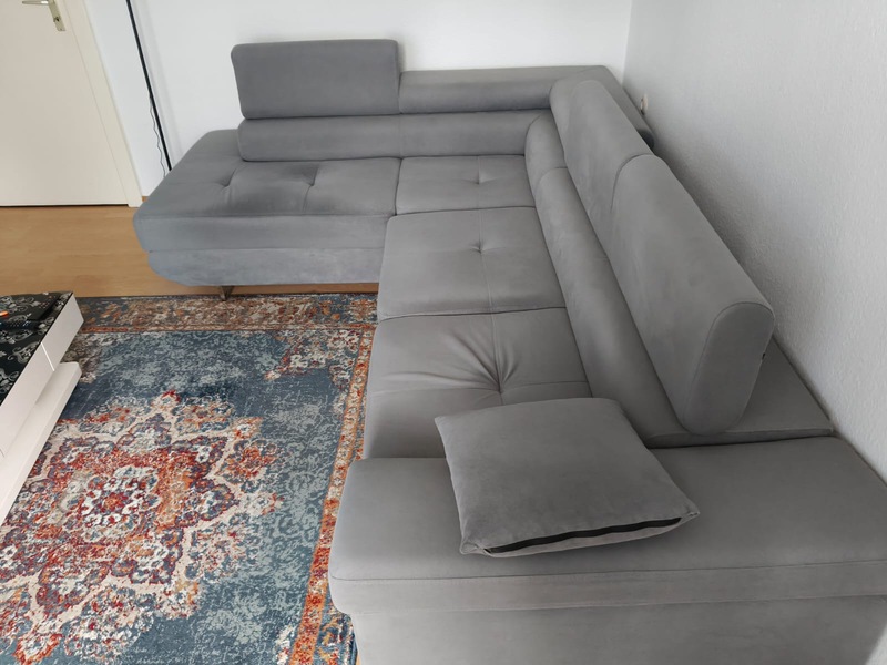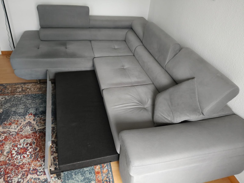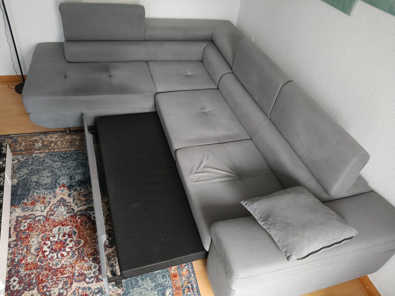 Hallo, wir verkaufen unser Ecksofa wegen Umzug. Es ist pflegeleicht, fast 2 Jahre alt. In der Farbe grau, mit der Schlaffunktion wird es noch bequemer.