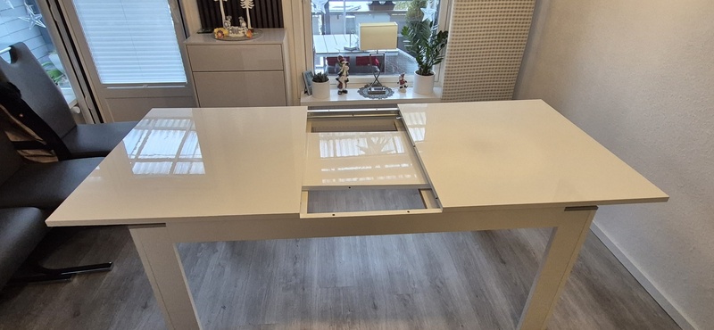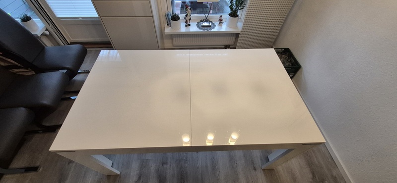 weißer Esstisch, Hochglanz, mit Einlegeplatte