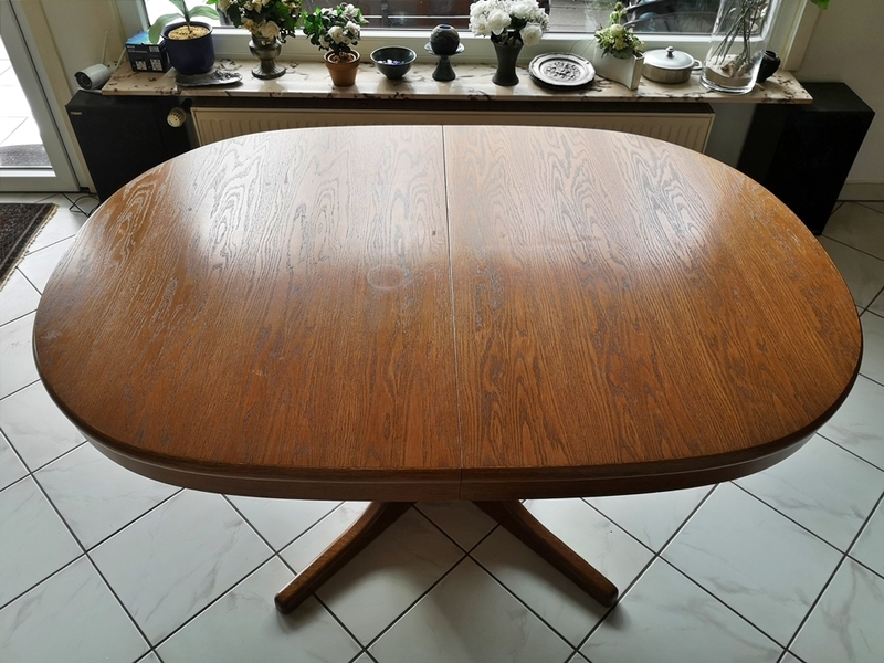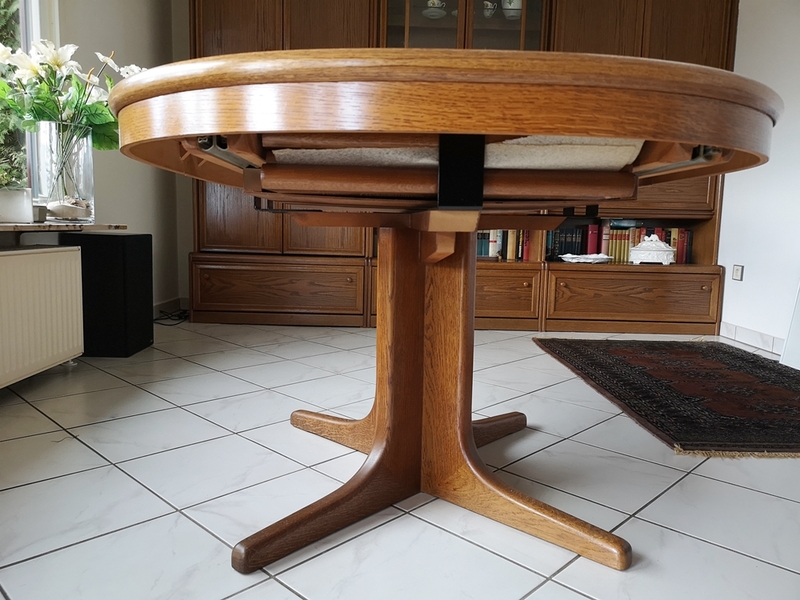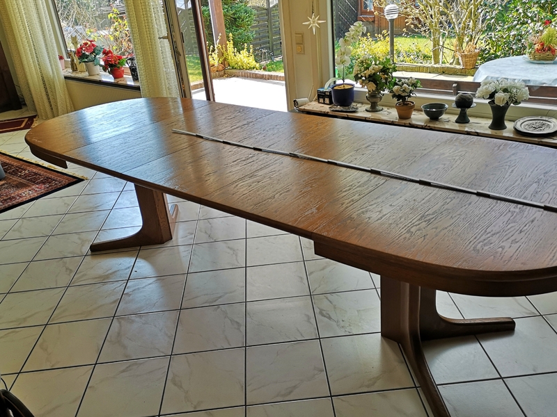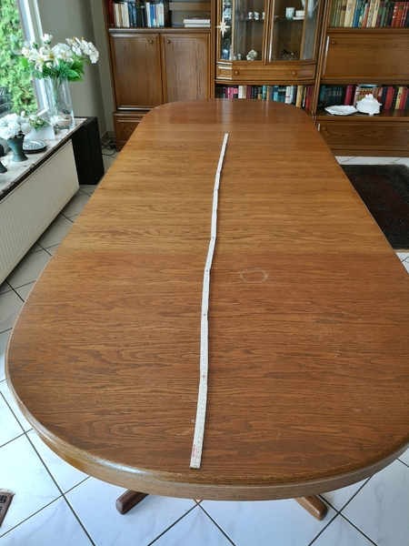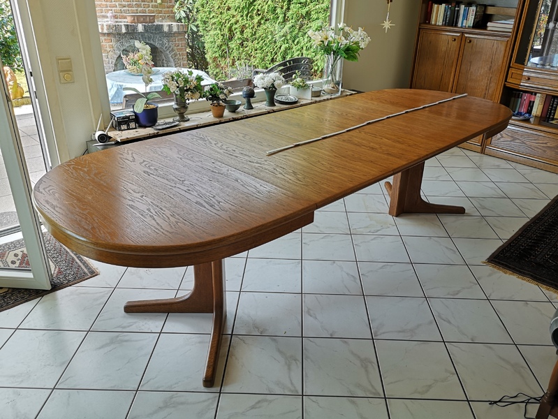 Im normalen Zustand ist er oval, man kann ihn aber auf über 3 m ausziehen. Auf den Bildern ist er knapp 3 m lang, es gibt aber noch eine weitere Platte, die man einlegen kann. Ich habe nur leider nicht verstanden, wie das geht.