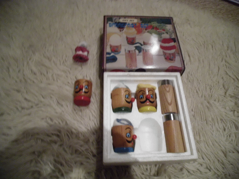 Ich verkaufe ein Früstücksset mit vier Eierbechern (Holz ) mit Pudelmütze und Salz - und Pfefferstreuer.