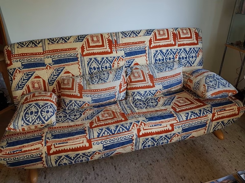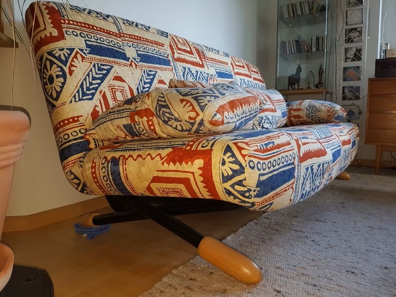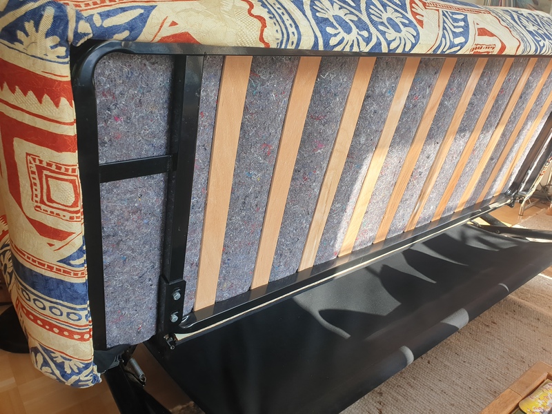 hochwertiges Funktionssofa - Stoff - Füße natur (Holz) - Stahlrahmengestell - Liegefläche auf Lattenrost 138 x 210 cm - hervorragender Liegekomfort - vier Kissen inklusive - alles sauber. Ablage für Bettzeug unter der Sitzfläche.
