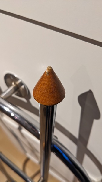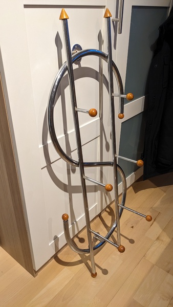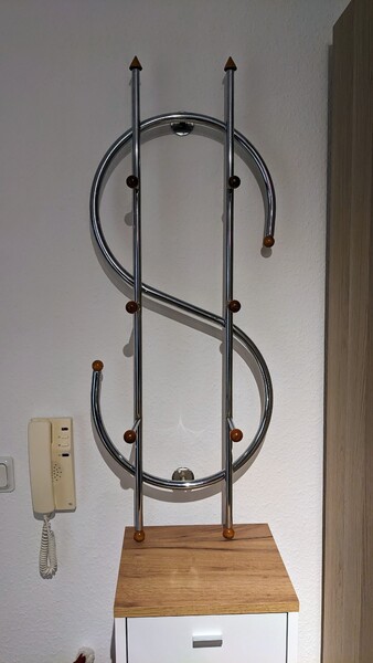 Die Garderobe ist silbern und aus Metall und hat an den Enden hölzerne, abgerundete, lackierte Aufsätze.