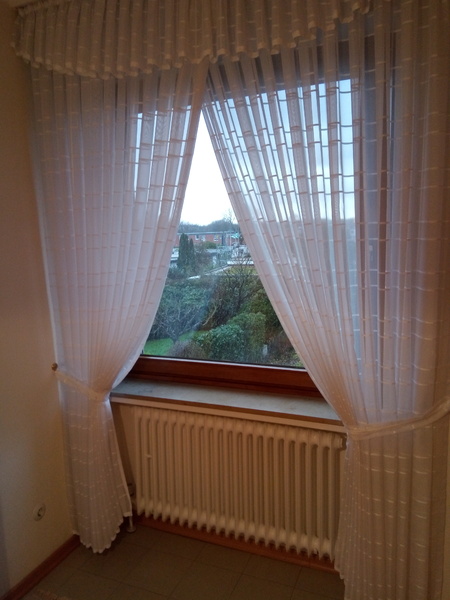 Gardine weiß. Schabracke 1.Schal 1,20m, 2. Schal 1,00m breit. Länge 2,50m. Schabracke 2,10m lang. Tiefste Stelle 0,37m. 21 Euro.