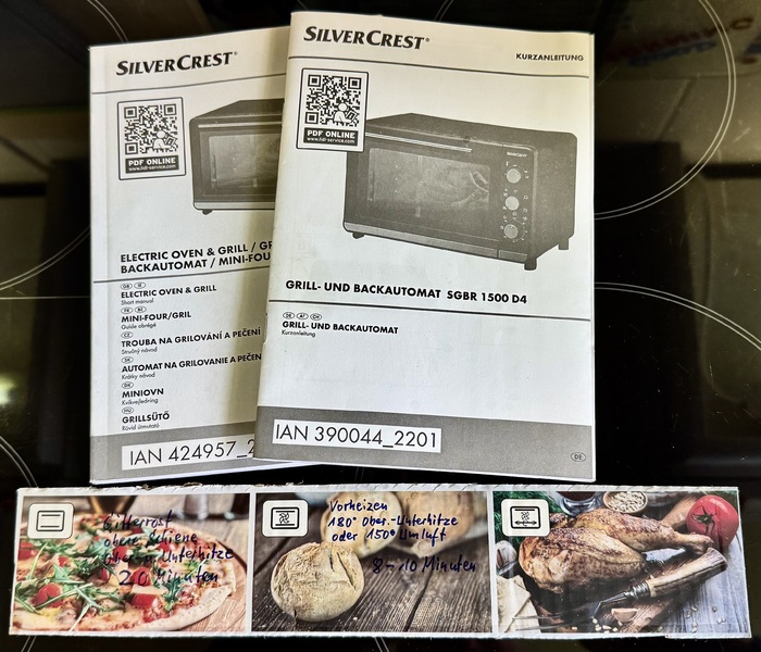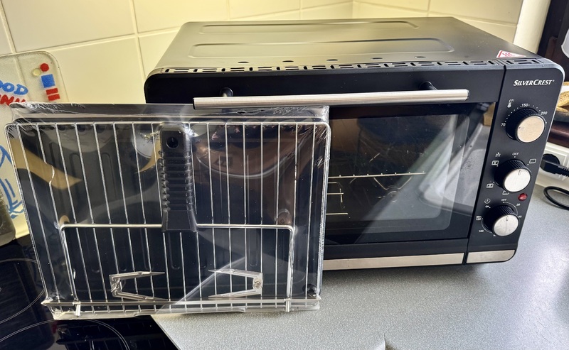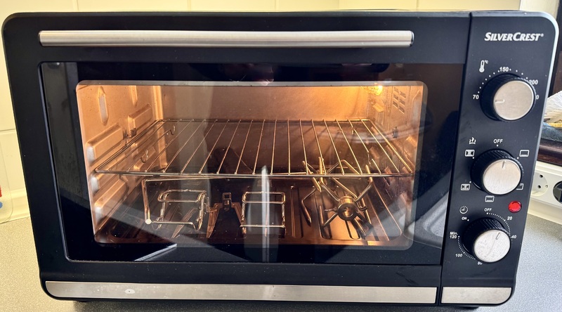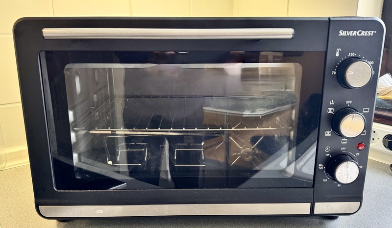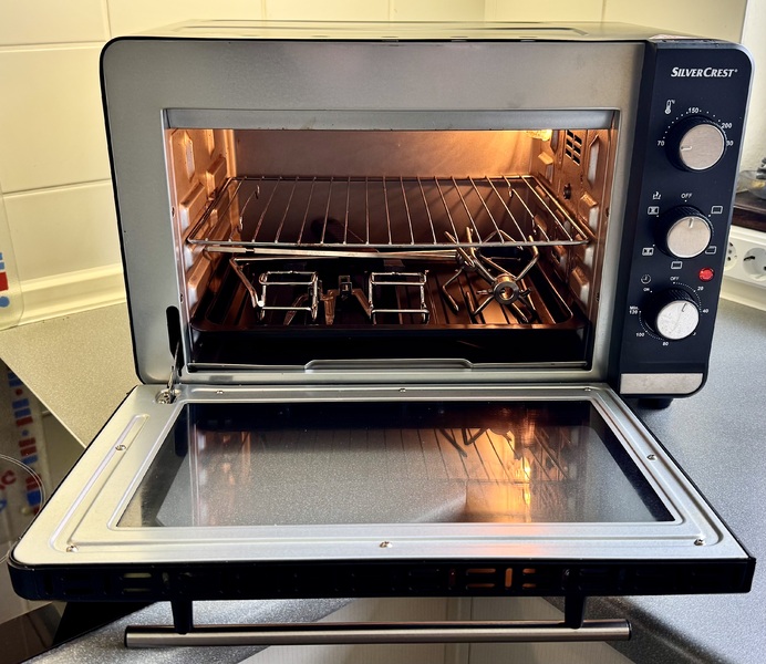 Neuwertiger und wenig benutzter Silvercrest Grill und Backautomat mit Drehspieß für Hähnchen sowie komplettem Zubehör-Set.