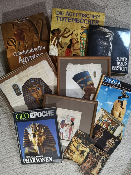 3 Papyrusbilder aus den 90er Jahren im Echtholzrahmen, 2 Bücher über Ägypten, einen Ausstellungskatalog von 1978 aus Hildesheim, ein altes Merian-Heft von 1967 und ein Geo-Heft.