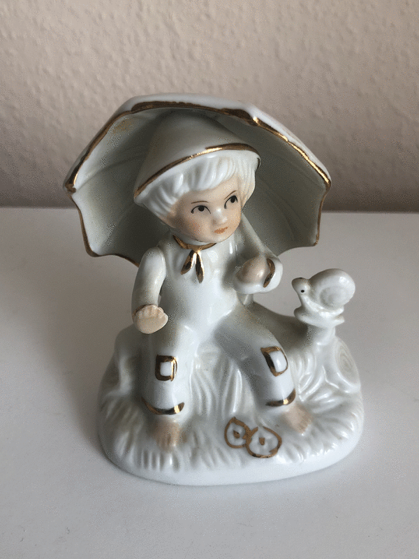 kleine Porzellanfigur, Junge sitzend mit Hut und Schirm, daneben eine kleine Schnecke,