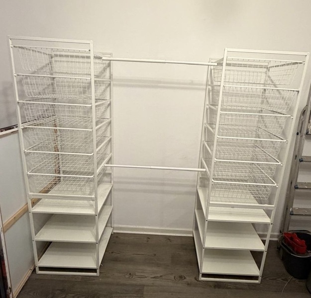 Wir verkaufen das IKEA Jonaxel Aufbewahrungssystem, welches auch als offener Kleiderschrank genutzt werden kann.