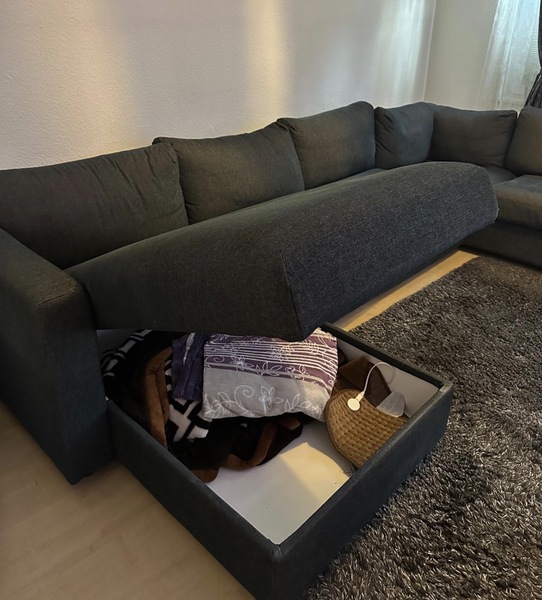 Das Sofa bietet zusätzlich Stauraum für z.B. Decken und Kissen und auch ein ausziehbares 140x200cm Bett. Perfekt, falls man Besuch erwartet.