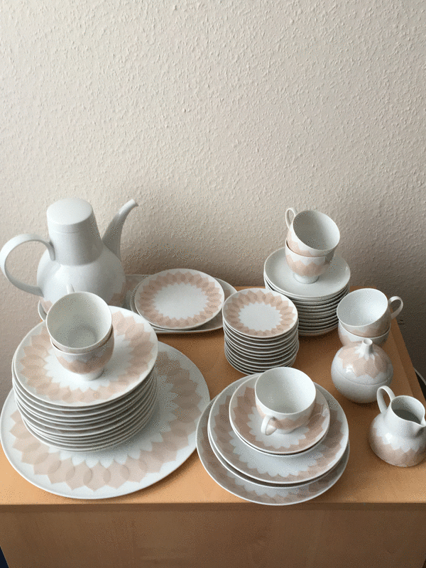 1 Zuckerdose, 1 kl. Milchkanne, 1 Kaffeekanne, 1 Tortenplatte rund, 1 Kuchenplatte lang,
