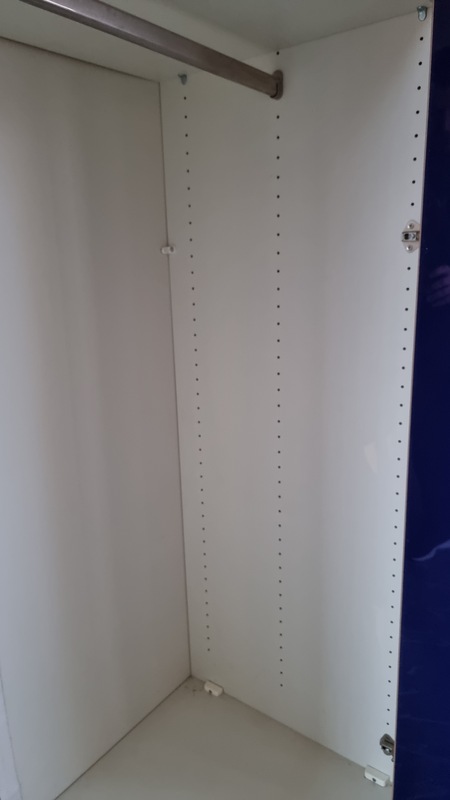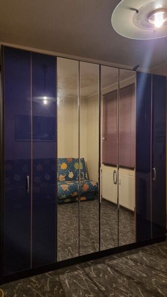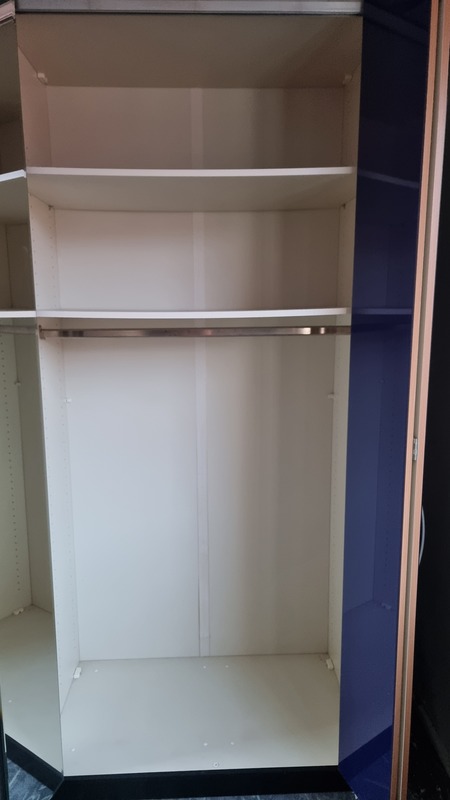 Biete einen sehr gut erhaltenen Kleiderschrank an. Türen als Falttürensystem. Mitte des Schranks mit Spiegeln ausgestattet, links und rechts mit dunkelblauen Glaselementen. Insgesamt zwei Kleiderstangen und vier Regalböden über den Stangen. Masse(B/T/H): 200 x 60 x 220 cm.