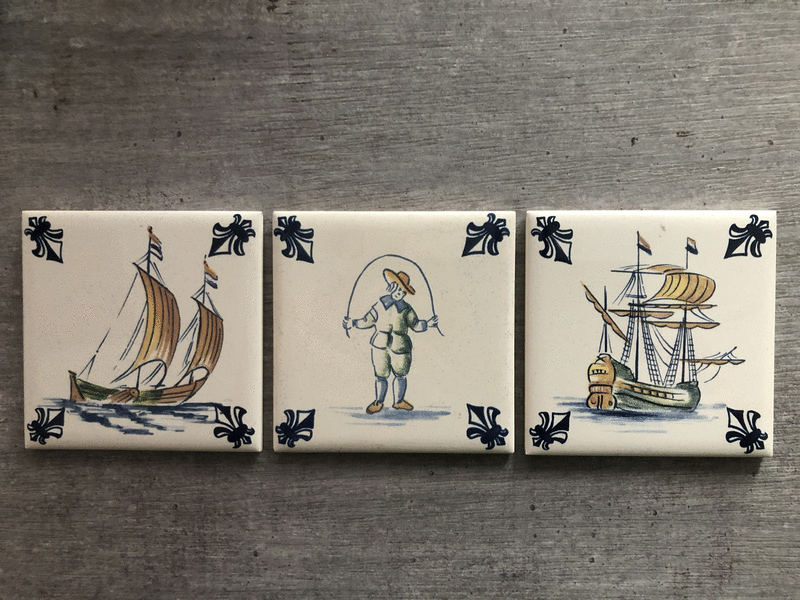 3 dekorative, handgemalte Fliesenuntersetzer - Delfter Fliesen 80er Jahre - KLM Royal Dutch Airlines 1, aus Holland. Maße pro Kachel: 7,5 x 7,5cm (3 x 3 Zoll), die Unterseite ist mit blauem KLM-Filz beschichtet.