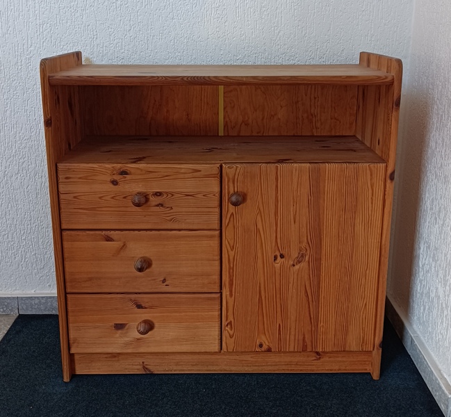 Die Kommode wurde aus massiver Kiefer gefertigt und gebeizt/gewachst.