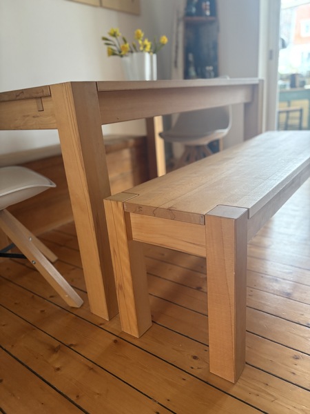 Verkaufe meinen schönen Esstisch aus Massivholz Wildbuche geölt mit passender Bank, sowie zwei Stühlen im Skandi Style.