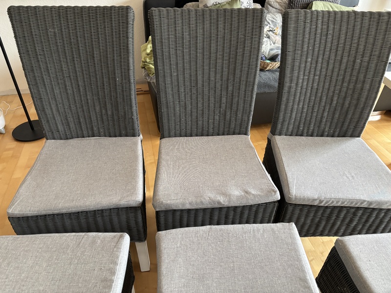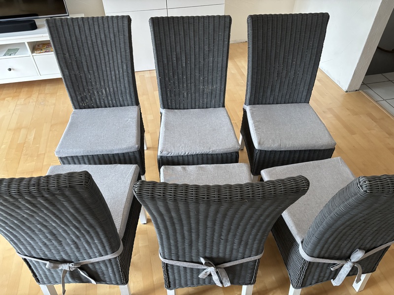 wir verkaufen hier 6 graue Landhaus Esstischstühle mit weißen Füßen und hellgrauen Sitzkissen aus Korb für 60 € Verhandlungsbasis.