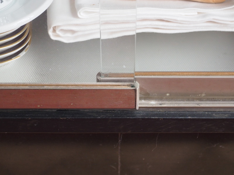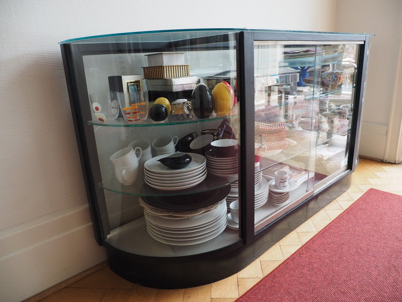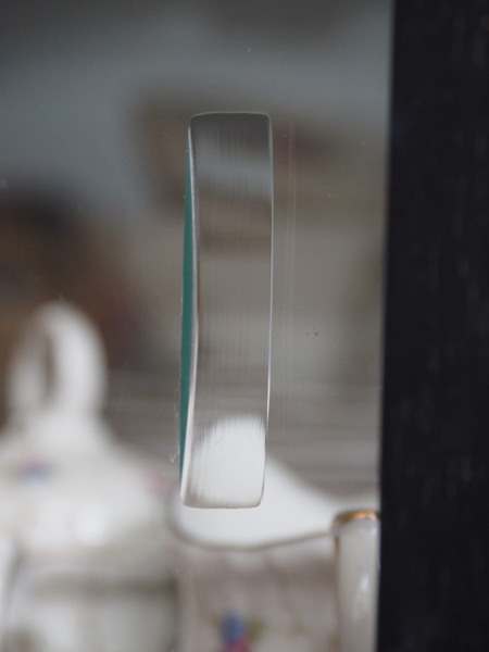 Zu öffnen ist die Vitrine mit 2 Schiebetüren, die oben und unten über eine Metalleinfassung verfügen, so dass die Glastüren nicht direkt auf dem Holz gleiten. Die Türen haben jeweils eine fein ausgearbeitete Griffmulde, ca. 15 x 55mm, so dass sie leicht zu bedienen sind. Die runden Seitenteile sind fest eingebaut und ebenso wie die obere Abdeckung aus Glas.