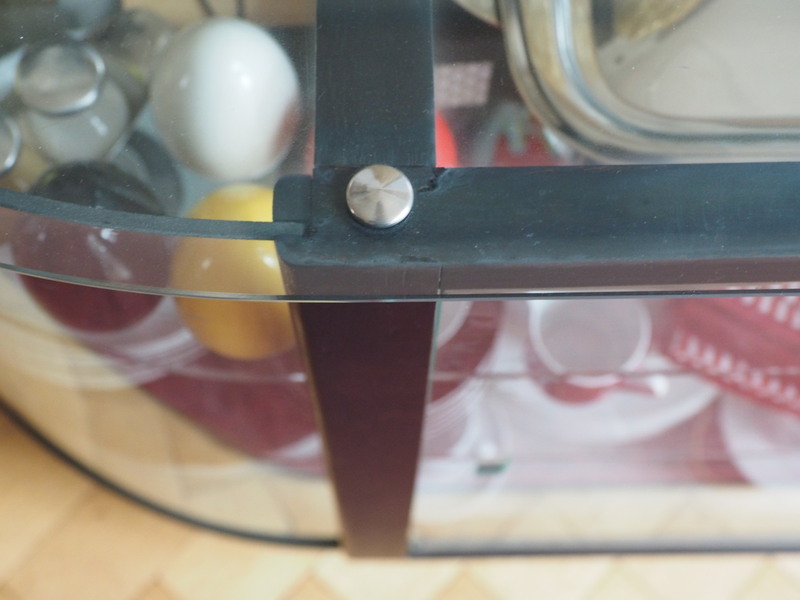 Die Vitrine hat 2 Glasböden, die 3 Fächer sind ca. 20 bzw. 23cm hoch.