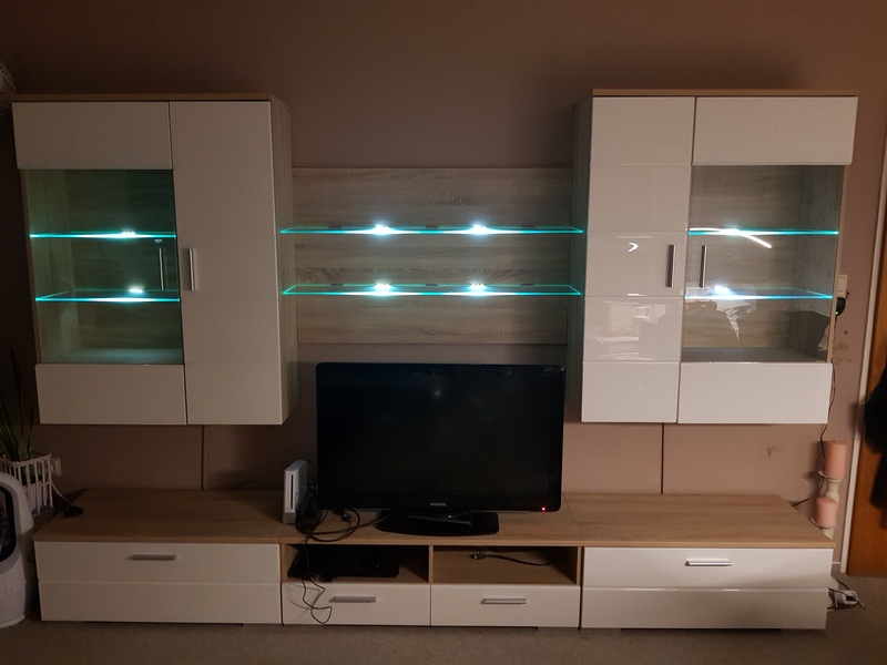 Biete einen großen Wohnzimmerschrank in hellem Holz und weiß hochglanz an. Sehr guter Zustand. Die 2 Hängeschränke sind mit Licht alles funktioniert einwandfrei habe es nie gebraucht und nur für die Fotos angemacht. Dieser Schrank ist nicht komplett zerlegt sondern nur die Türen sind abmontiert kann daher gut abtransportiert werden. Der Schrank ist 2.90m breit das heißt 1 Schrank je rechts und links 0.90m breit zusammen 1.80m und der mittlere wo der Fernseher drauf stand ist 1.10m breit. Die Hängeschränke haben eine Höhe von ca. 1.20m und Breite von 0.90m. Zwischen den beiden Hängeschränken das Bord mit den beleuchteten Glasböden hat eine Breite von 1.10m. Sehr gut erhalten und gepflegt hat nur 1 kleine Stelle in einem der Hängeschränke bei Ansicht weise ich dann nochmal daraufhin.