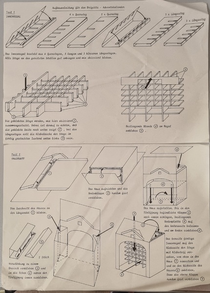 Der Kalender ist nie gebastelt worden, alle Teile sind vorhanden (mehrere großformatige Bögen, Anleitung, Innenregal etc.).