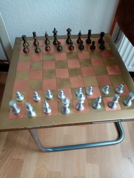 Schachbrett und Figuren aus Messing und Zink 46x46cm 30 Euro, Setzkasten B57xH47xT11 10 Euro. Nur Abholung Huchting. Tannenbaum Staender 10 Euro. Warmhalteplatte 10 Euro