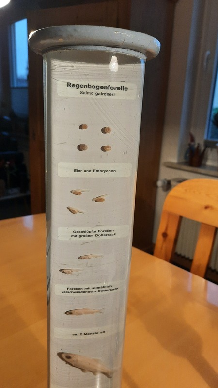 verkaufe Zoologisches Präparat der Regenbogenforelle in ihren Entwicklungstufen im Schauglas.