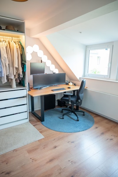 Eine Vollholztreppe ebnet den Weg ins Obergeschoss mit Schlafzimmer, modernem Vollbad (Fußbodenheizung + Handtuchheizkörper) und einem weiteren Zimmer. Über dieses gelangt man in das ausgebaute Dachgeschoss, wo sich ein zusätzlicher Raum befindet, mit viel Licht durch eine neu entstandene Gaube und direkten Zugang zur ca. 15 m² großen Dachterrasse. Hier lässt sich die Sonne bis in den späten Abend genießen.