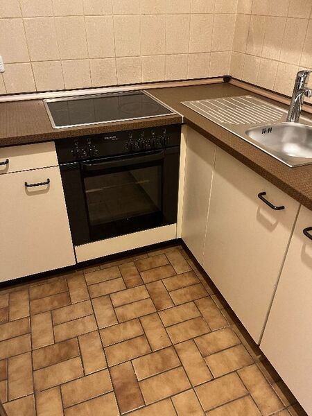 Die Einbauküche ist mit Hängeschränken, Herd und Kühlschrank ausgestattet.