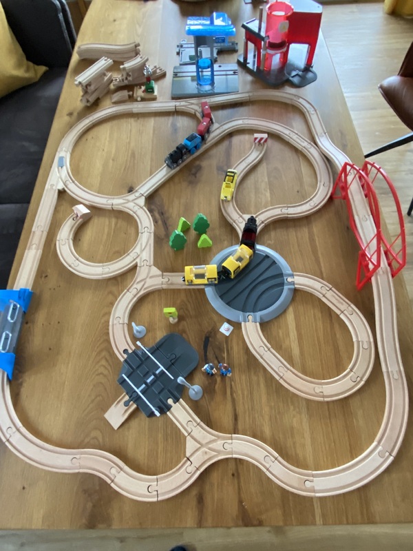 Holzeisenbahn , neuwertig, bestehend aus 80 Schienen, Weichen, Bahnhof etc. für 35,00 Euro zu verkaufen.
